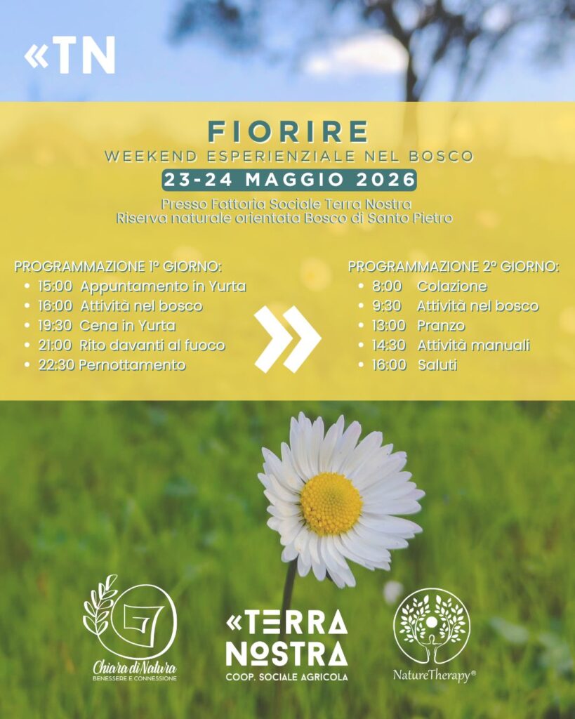 La Coopertiva Sociale Terra Nostra e Chiara di Natura sono lieti di invitarvi a trascorrere due giorni per ritrovare il proprio centro, rallentare e fiorire ancora, in sincrono con Madre Natura presso Fattoria Sociale Terra Nostra – Riserva naturale orientata Bosco di Santo Pietro (Caltagirone)